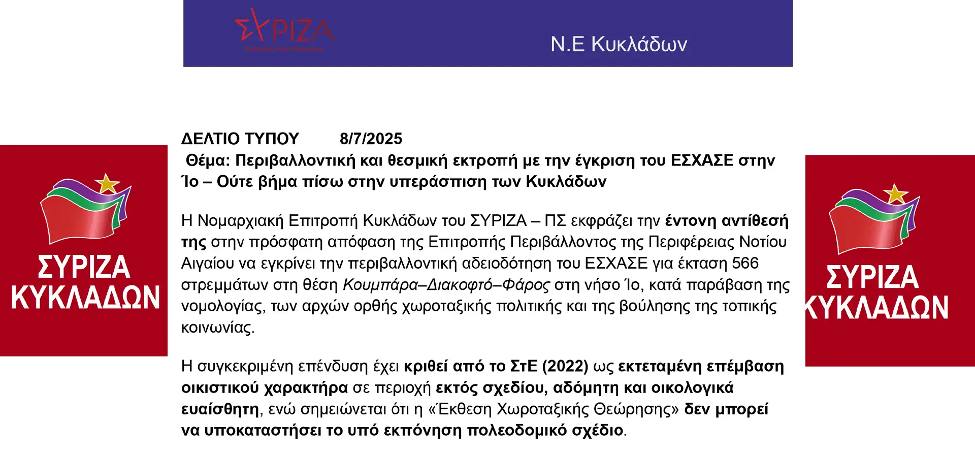Δελτίο Τύπου 8/7/2025 Περιβαλλοντική και Θεσμική Εκτροπή…